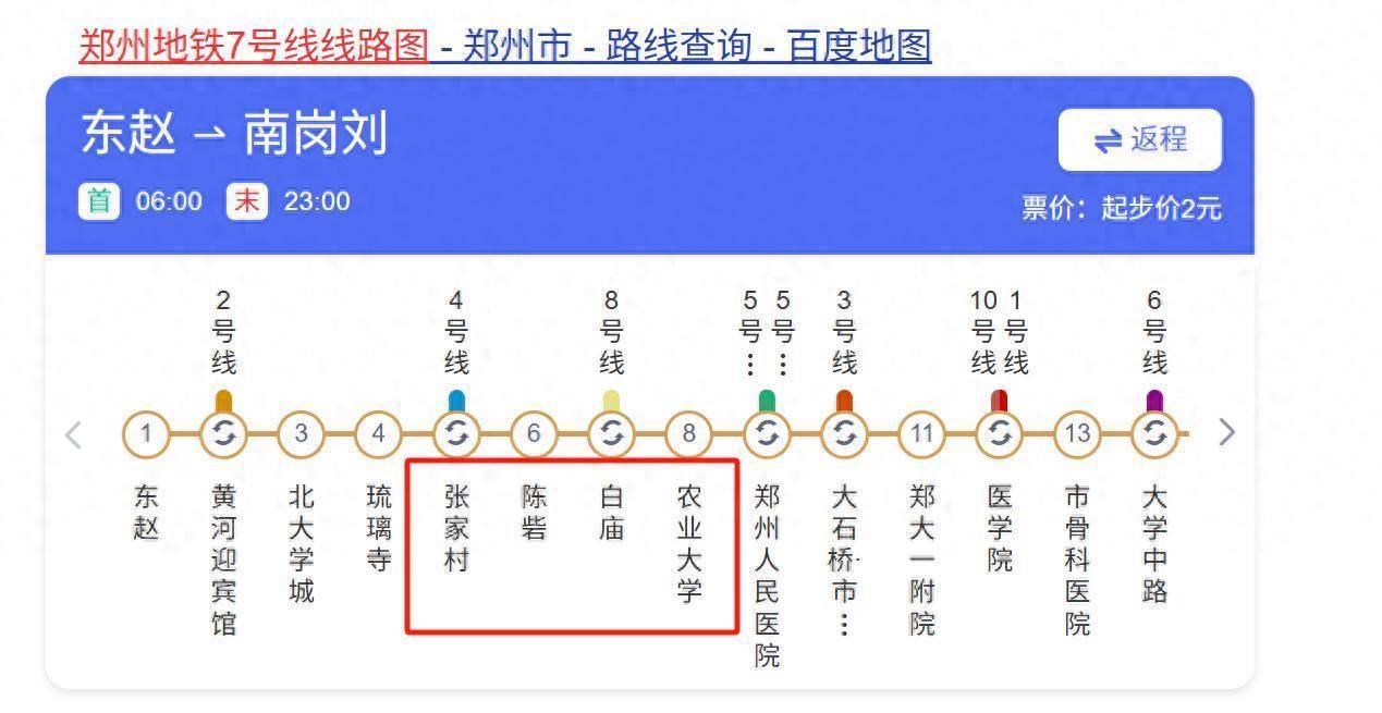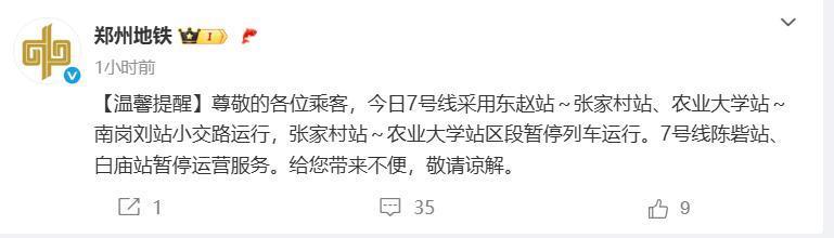 尊敬的各位乘客,今日7号线采用东赵站~张家村站、农业大学站~南岗刘站小交路运行,张家村站~农业大学站区段暂停列车运行。7号线陈砦站、白庙站暂停运营服务。给您带来不便,敬请谅解。
